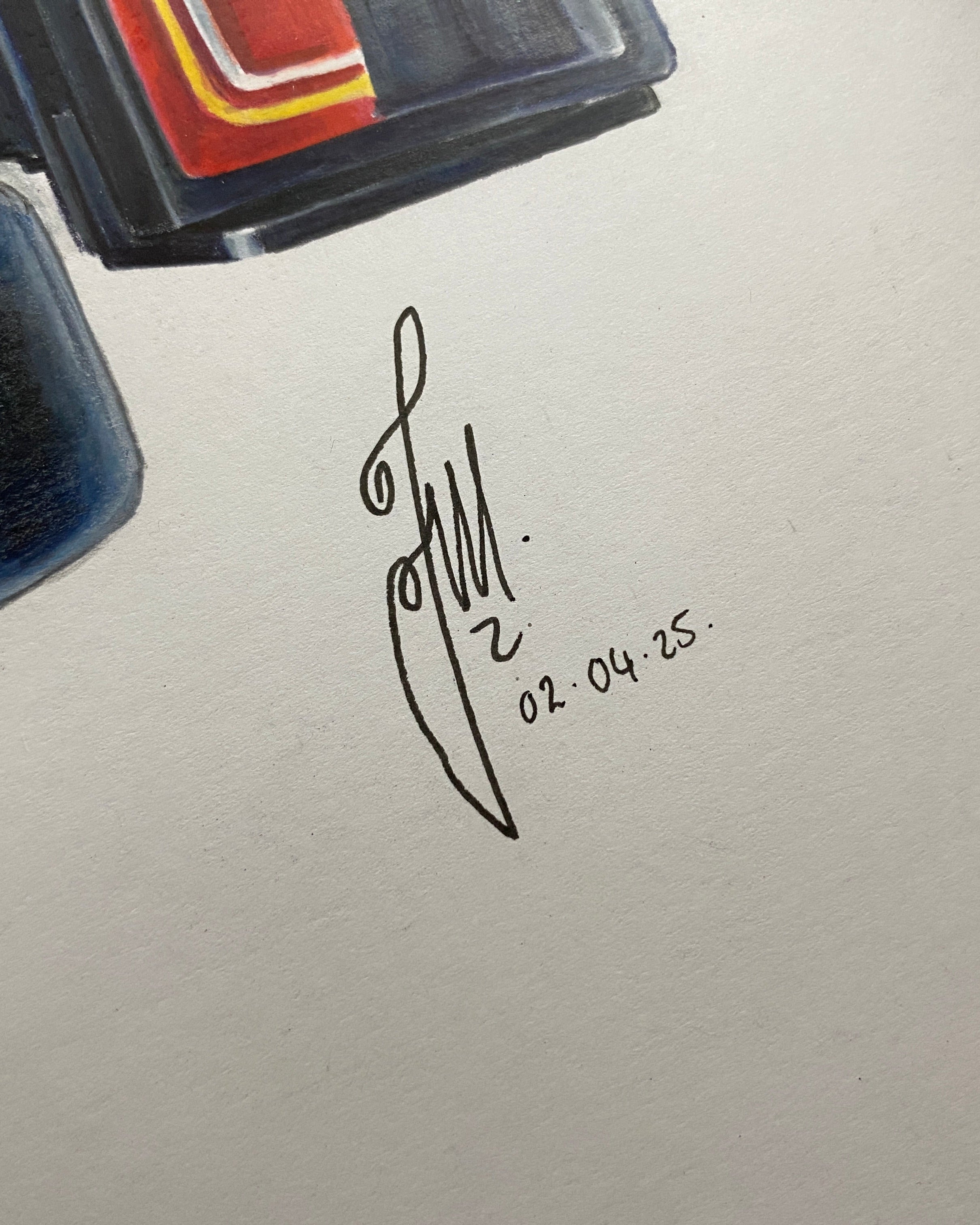 The drawing is signed in the bottom right hand corner alongside the day it was finished (2nd April 2025)