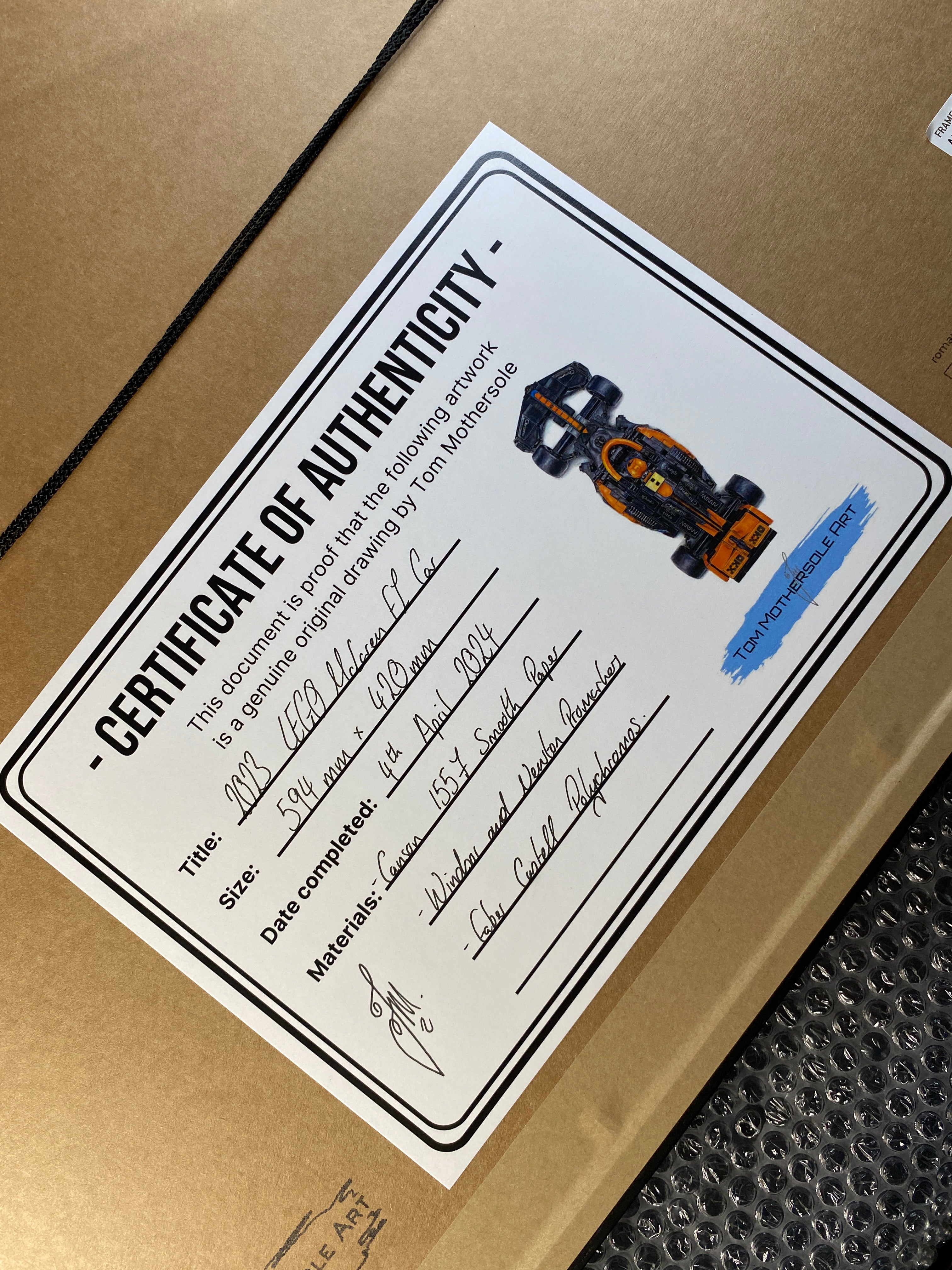 The certificate also states the exact materials that were used to create the piece.